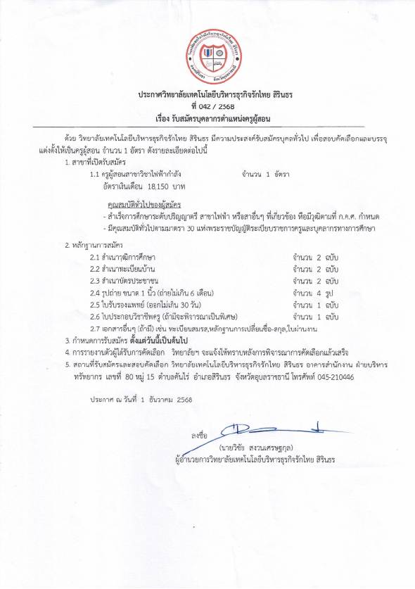ประกาศ!! เปิดรับสมัครบุคลากร ตำแหน่งครูผู้สอน สาขาวิชาช่างไฟฟ้ากำลัง 1 อัตรา